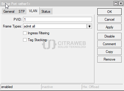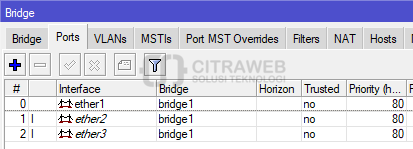 Pada kasus ini ether1 adalah trunk, ether2, dan ether3 adalah port access yang