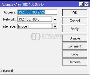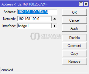 Selanjutnya konfigurasikan IP address untuk vlan management pada interface bridge