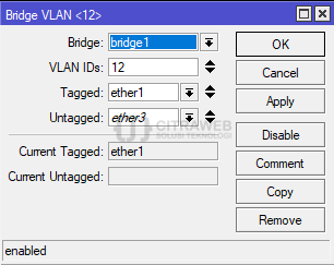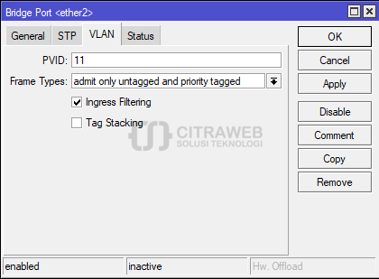 Pertama, buat bridge untuk ether1 (trunk), ether2 (access), dan ether3 (access). Jangan lupa tentukan pvid untuk port access, detail cek pada gambar berikut: