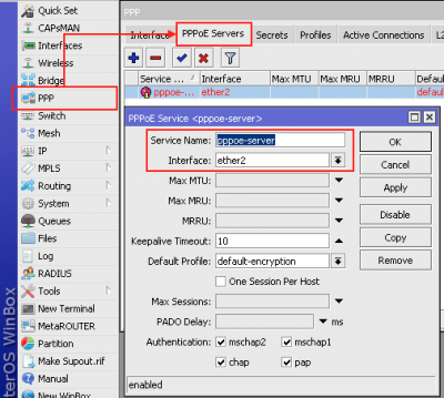 Buat PPPOE Server menuju ke interface yang menuju ke client yaitu ether2.