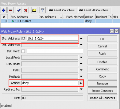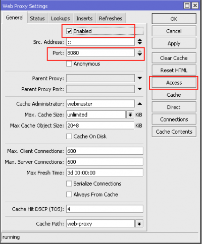 Buka menu IP>Webproxy lalu aktifkan webproxy dengan mencentang Enabled.