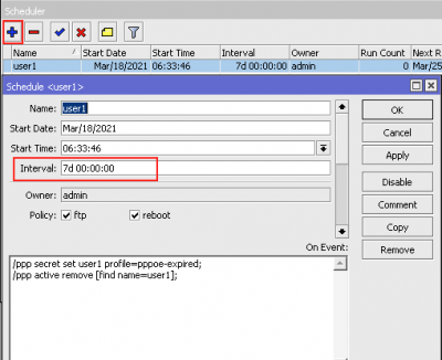 Scheduler digunakan untuk menjalankan script secara berkala, berdasarkan berapa lama client berlangganan internet. Tambahkan rule baru yang akan berfungsi untuk merubah profile user dari pppoe-active menjadi pppoe-expired.