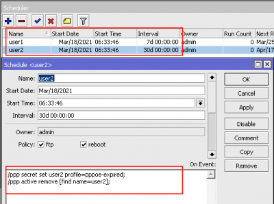 Sedangkan user2, karena langganan 30 hari maka interval yang digunakan adalah 30d dengan script yang sama. Saat waktu habis, maka client akan terkoneksi menggunakan profile pppoe-expired.