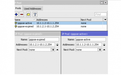 Pool active untuk client yang boleh mengakses ke internet. Sedangkan pool expired digunakan untuk client yang tidak boleh mengakses internet dan akan mendapatkan notifikasi webproxy.