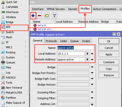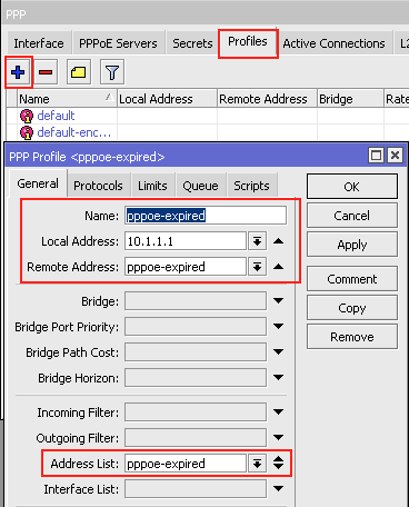 Selanjutnya, masuk ke PPP>Profiles untuk membuat profile baru. Tambahkan 2 profile untuk pppoe active dan pppoe expired. Local address adalah IP yang akan digunakan PPPOE Server saat terdapat client terkoneksi, kita isi 10.1.1.1.