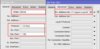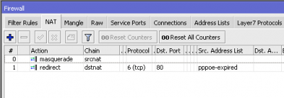 Scr-address list bisa menggunakan pppoe-expired dengan action redirect. Parameter To-Ports pastikan sama dengan port webproxy sebelumnya, yaitu 8080.