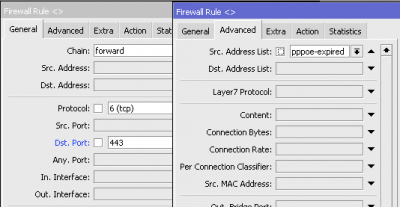 Untuk mencegah user - user yang sudah expired masa langganannya mengakses service lain di internet selain http, perlu kita tambahkan rule drop untuk paket forward yang berasal dari user PPPoE expired pada Firewall Filter seperti berikut :