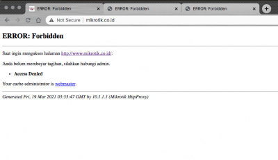 Tetapi jika profile di pindah ke pppoe-expired, client akan diblokir oleh webproxy dan tidak bisa mengakses internet sama sekali.