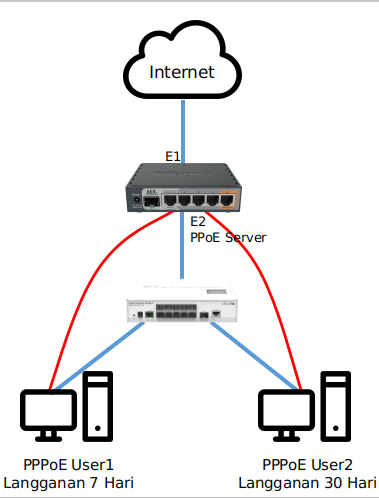 Contoh topologinya, sebuah router menggunakan service pppoe untuk terkoneksi ke client. Dan terdapat 2 user yang menggunakan layanan yang berbeda. User1 berlangganan 7 hari dan user2 berlangganan 30 hari.