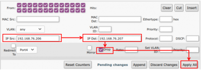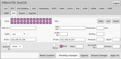 Nah, untuk mengatasi hal tersebut kita dapat mengimplementasikan action drop pada ACL ini. Caranya dengan mencentang seluruh port pada parameter from, kemudian masukkan IP Address gateway pada parameter IP src.