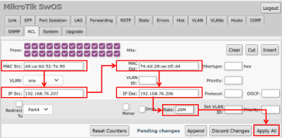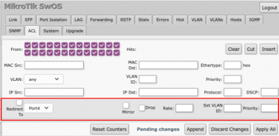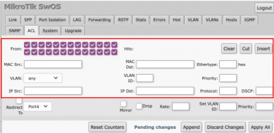 ACL bisa digunakan untuk memfilter packet, forwarding, dan vlan table yang melewati switch. Fitur ACL ini sudah disupport di semua perangkat switch dengan sistem operasi SWOS. Pembuatan rule pada ACL bisa berdasarkan parameter Layer 2 ataupun Layer 3.