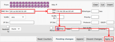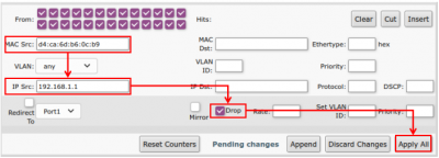Rule seperti di gambar akan melakukan blokir paket yang memiliki kombinasi src mac d4:ca:6d:b6:0c:b9 dan IP src 192.168.1.1.