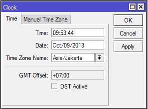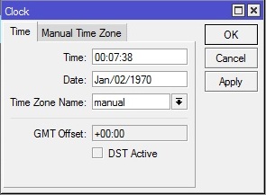 Pengaturan waktu pada Router Mikrotik bisa dilakukan pada menu System > Clock. By default waktu pada Router Mikrotik menunjukkan jam 00:00:00 tanggal Jan/02/1970. Harus dilakukan penyesuaian waktu pada Router.