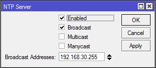 Pengaturan NTP Server tersebut menggunakan type penyebaran Broadcast, sehingga pada NTP