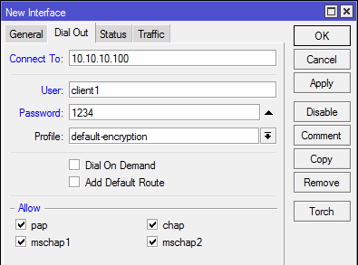Tambahkan interface baru PPTP Client, lakukan dial ke IP Public Router A (PPTP