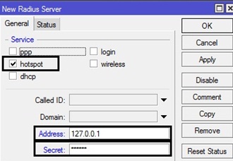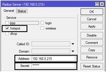 - Shared secret kita sesuaikan dengan parameter secret yang ada di menu Radius