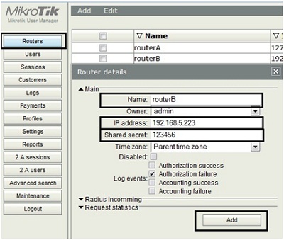Sampai di sini, router A dan router B sudah terintegrasi dengan database UserManager