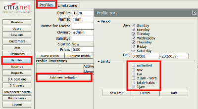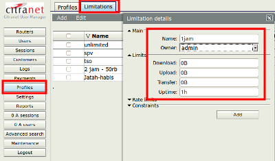 - Pilih menu profile - Limitations - add new, iskan name, owner dan limitasi yang
