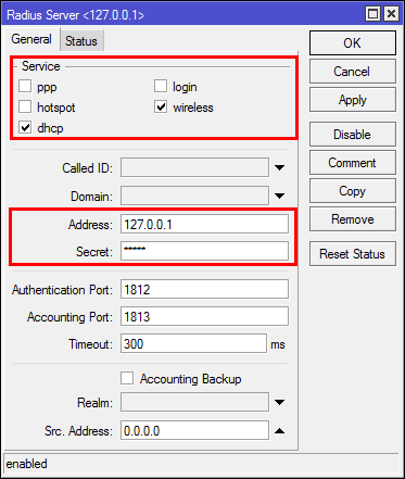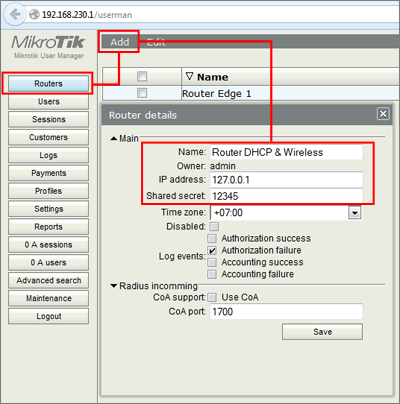 Pada contoh diatas, kami gunakan IP address 127.0.0.1 karena service UserManager dan service DHCP/Wireless masih berada di dalam router yang sama. Jika pada implementasi real, ketika router UserManager terpisah dengan router DHCP/Wireless, IP address Anda isi dengan IP Address router yang menjalankan service UserManager.