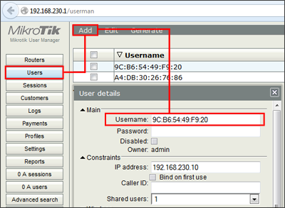 Terakhir, buat User di UserManager dengan mac-address client DHCP atau Wireless sebagai username. Masuk ke menu "User" --> klik "Add". Isikan mac-address perangkat client sebagai username.