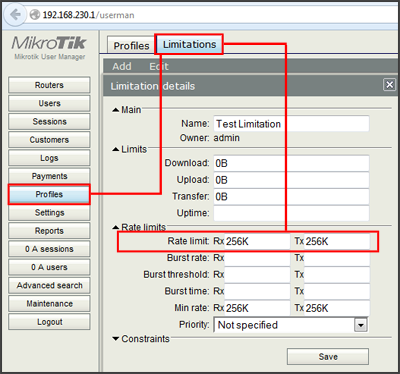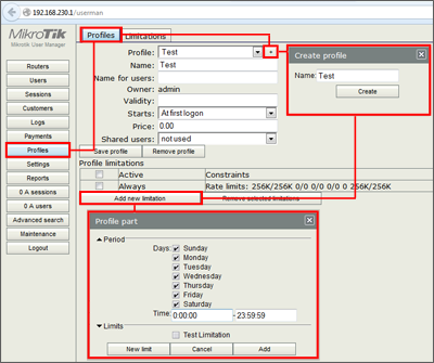 Jika limitation sudah dibuat, selanjutnya buat profile dan tambahkan limitation yang sudah dibuat ke dalam profile tersebut.