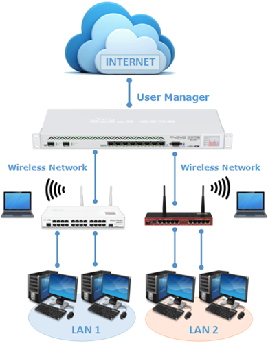 MikroTik memiliki fitur radius server yang disebut UserManager.  UserManager akan memudahkan ketika kita yang ingin membuat layanan jaringan yang didistribusaikan secara luas, misal hotspot di cafe, mall, hotel dan sebagainya. Dengan menggunakan UserManager ini kita cukup membuat satu account user di router utama, dan account user tersebut bisa digunakan atau diakses dari router DHCP/Wireless. Gambaran topologi jaringan yang menggunakan UserManager sebagai radius server :