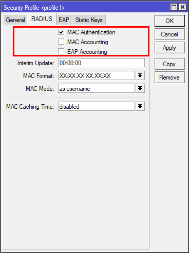 Begitu juga pada security profile wireless, agar client wireless bisa di-manage oleh UserManager. Masuk ke menu Wireless --> klik Tab "Security Profiles". Buat Security Profiles baru, pada Tab RADIUS, klik opsi "MAC Authentication".