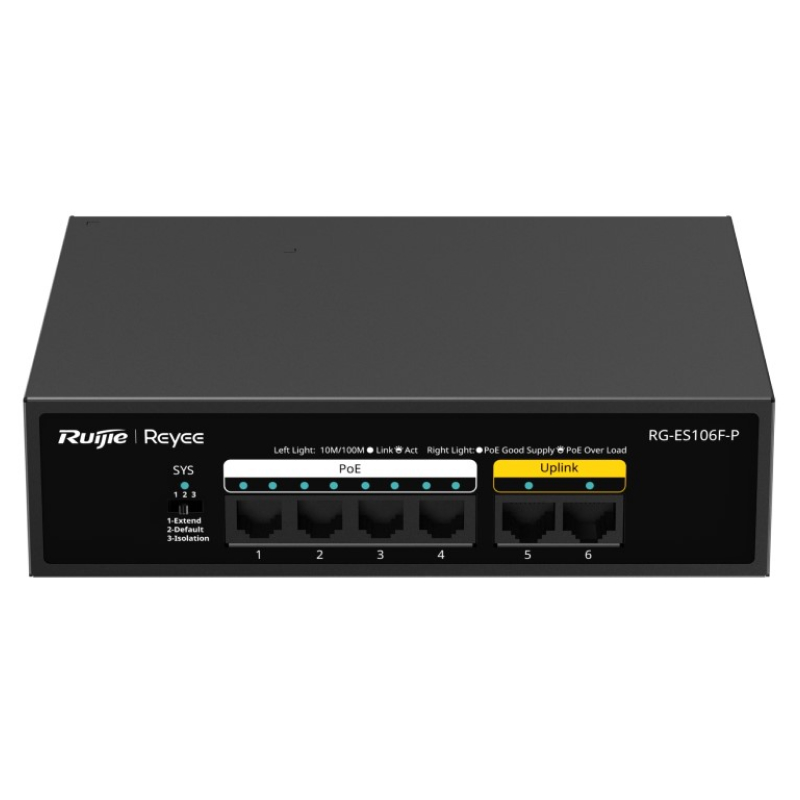 RG-ES106F-P Ruijie Reyee 6-Port 10/100 Mbps Unmanaged PoE Switch with 4 of the ports support PoE/PoE+.