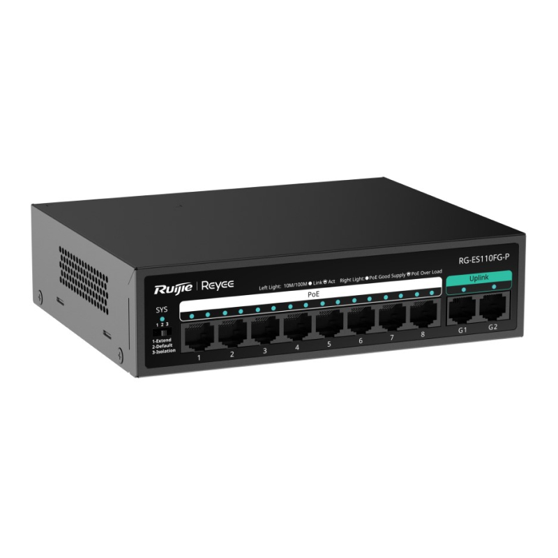 RG-ES110FG-P Ruijie Reyee 8-Port 100Mbps + 2 Uplink Port 1000Mbps, 8 of the ports support PoE/PoE+. Max PoE power budget is 110W, Steel Case.