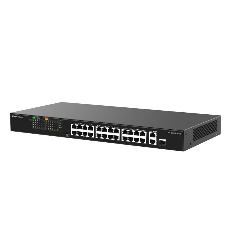 RG-ES126FGS-LP with 24-Port 100Mbps + 1 Uplink Port 1000Mbps + 1 Gigabit RJ45/SFP combo Ports, 24 of the ports support PoE/PoE+ power supply. Max PoE power budget is 180W, Steel Case.