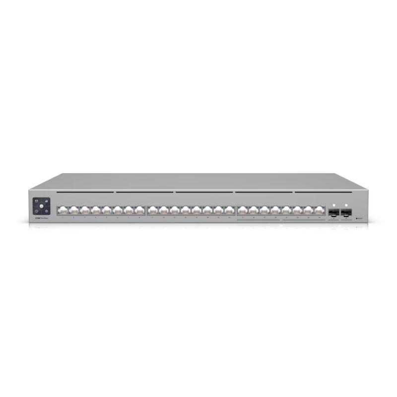 USW-Pro-Max-24 UniFi 24-port, Layer 3 Etherlighting switch with 16-port GbE, 8-port 2.5 GbE, 2-port SFP+ 10G and DC Power Backup.